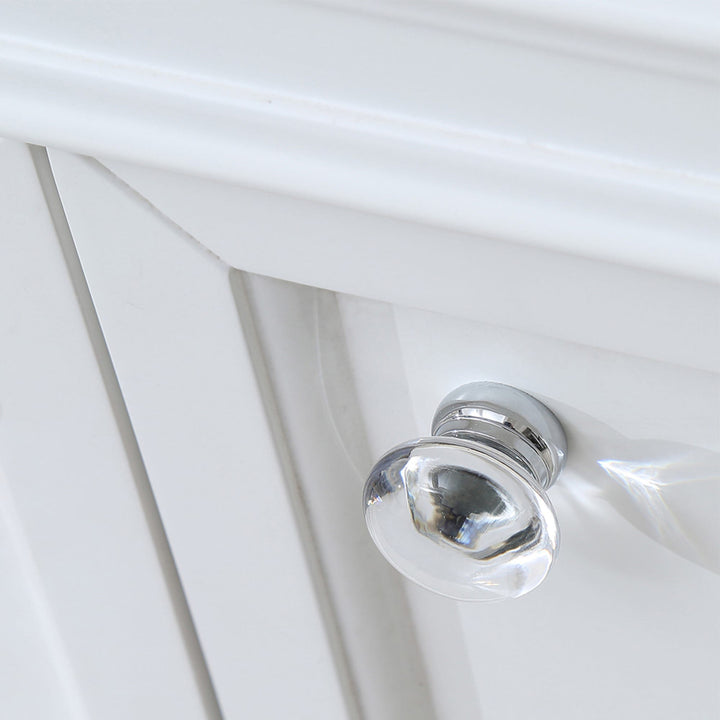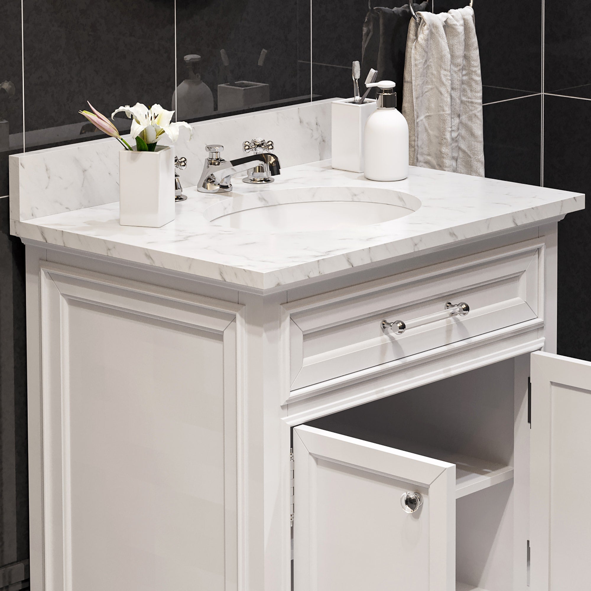 Add timeless elegance to your bathroom with the 30" Derby Single Sink Bathroom Vanity in Pure White. Expertly crafted from solid hardwood, this freestanding piece features a clean white finish, crystal chrome hardware, and a 1" thick Carrara marble countertop with a 4" backsplash. A white oval undermount sink, pre-drilled 8" widespread faucet holes, and magnetic-clasp doors complete the design. With a cabinet and adjustable shelf, this vanity offers practical storage in a classic style that suits any space.
