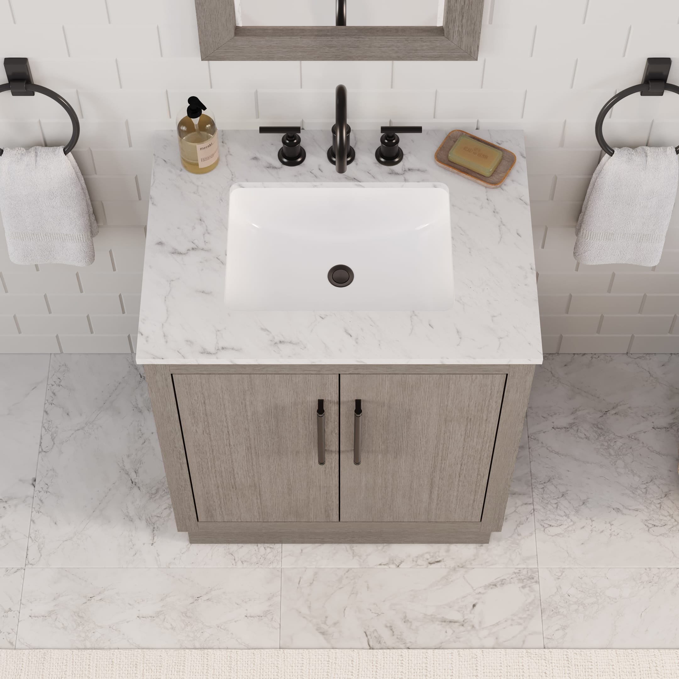 Bring natural richness into your bathroom with the Hugo 30-inch vanity in Grey Oak. Designed with a 1-inch-thick Carrara white marble top and pre-drilled 8-inch widespread faucet holes, it also includes a ceramic undermount sink with overflow. Storage is provided by a soft-close cabinet with adjustable shelf. Finished in oil-rubbed bronze, solid brass hardware, this light wood, solid hardwood vanity arrives freestanding and fully assembled with a rear cutout for simple installation.