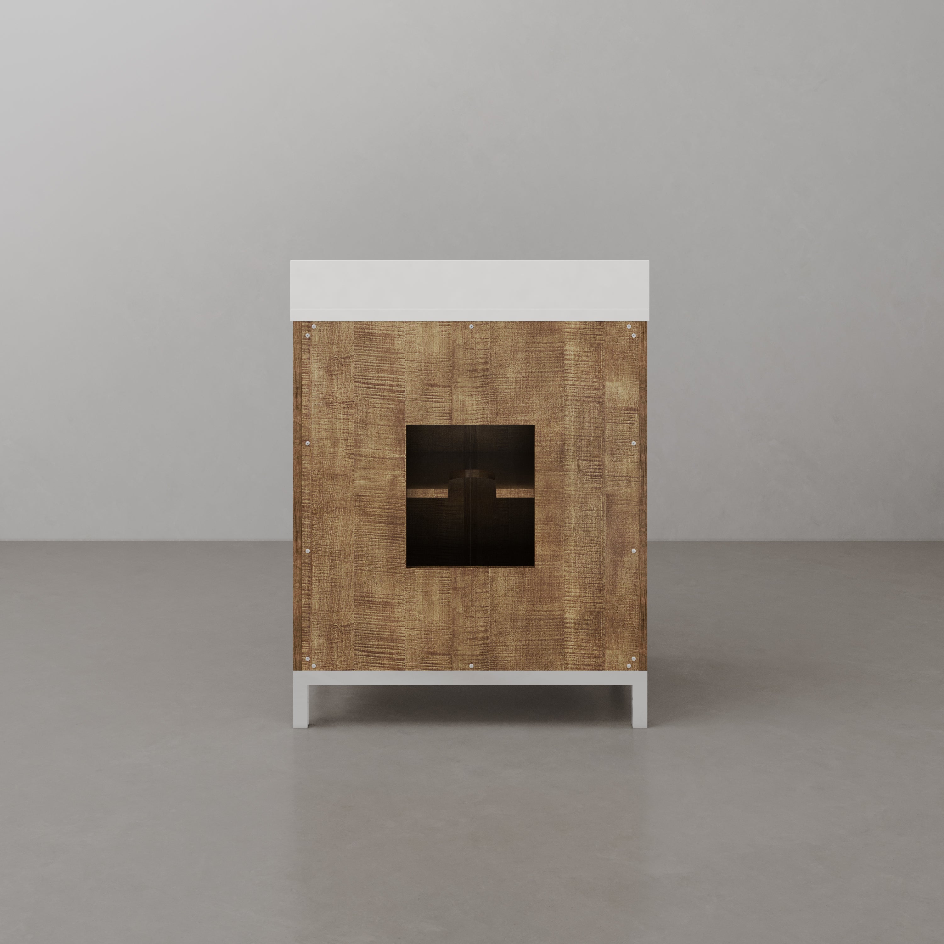 Freestanding and fully assembled, featuring a plumbing cutout for easy installation