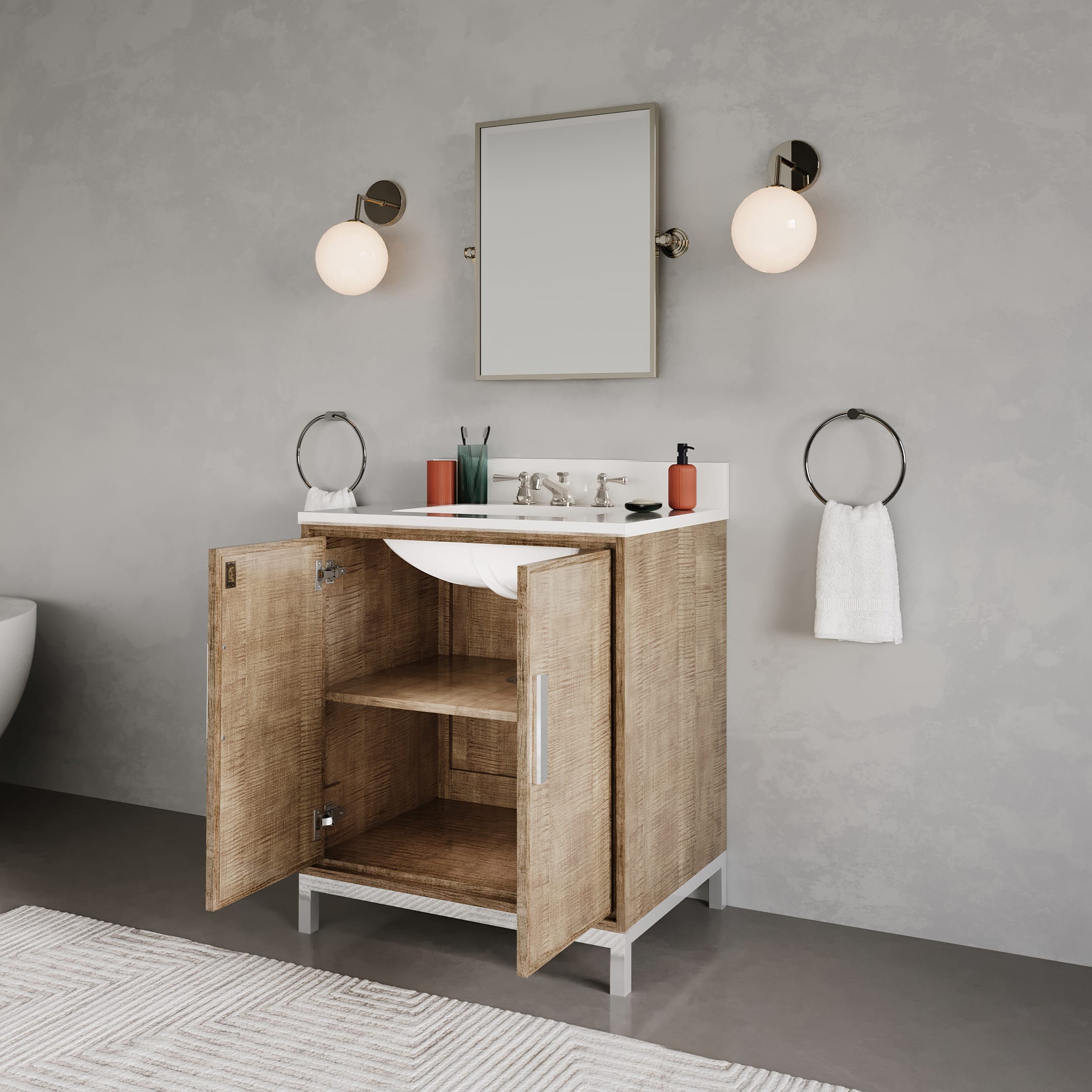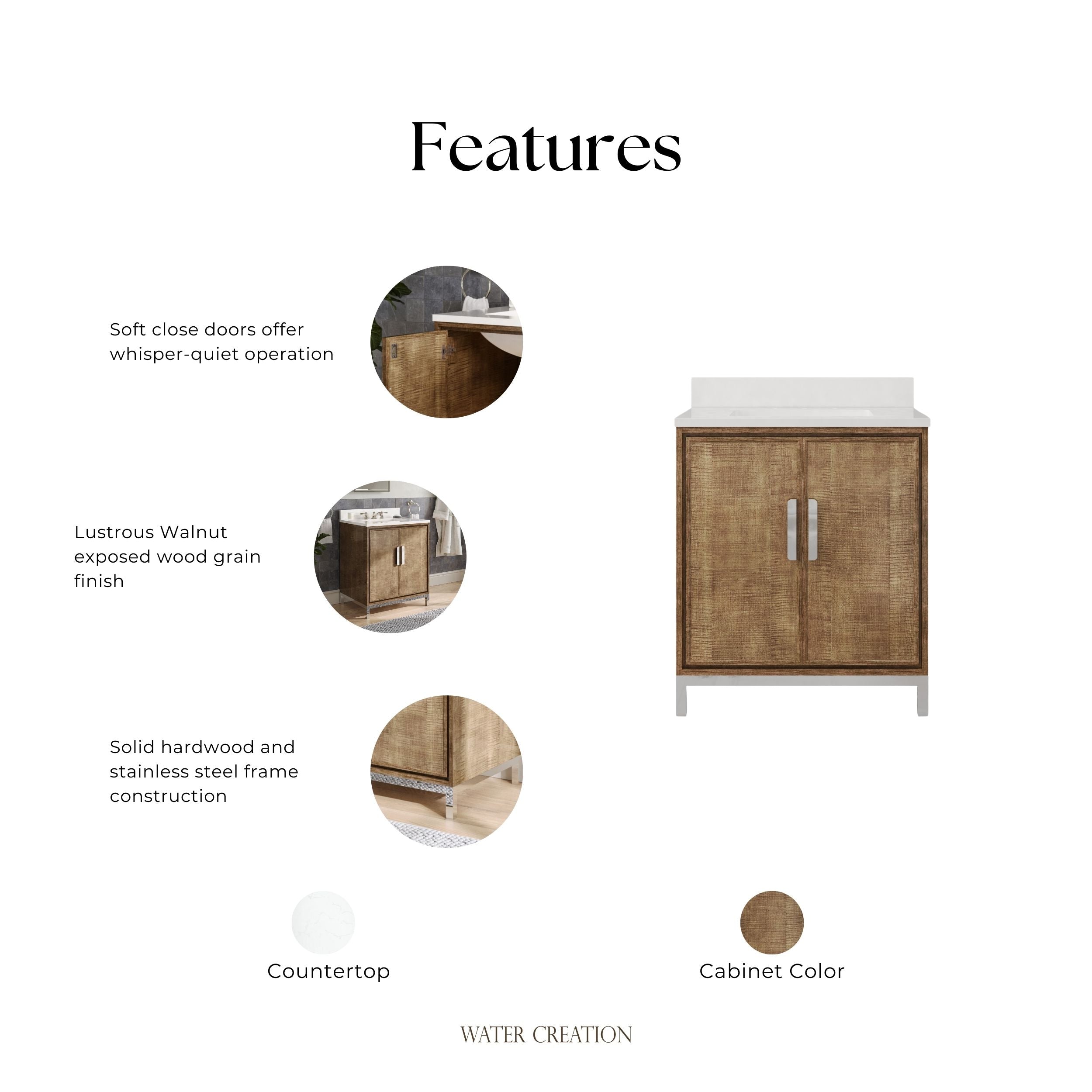 Refine your bathroom with the clean lines and light wood finish of the 30" Westin Vanity in Lustrous Walnut. A 1" thick Whitebrook quartz countertop and matching 4" backsplash sit above a white ceramic undermount sink, with pre-drilled 8" widespread faucet holes for easy faucet installation. The solid hardwood cabinet includes soft-close doors and an adjustable shelf, offering simple storage in a compact size. Finished with Chrome hardware, its a smart choice for smaller spaces with a modern edge.