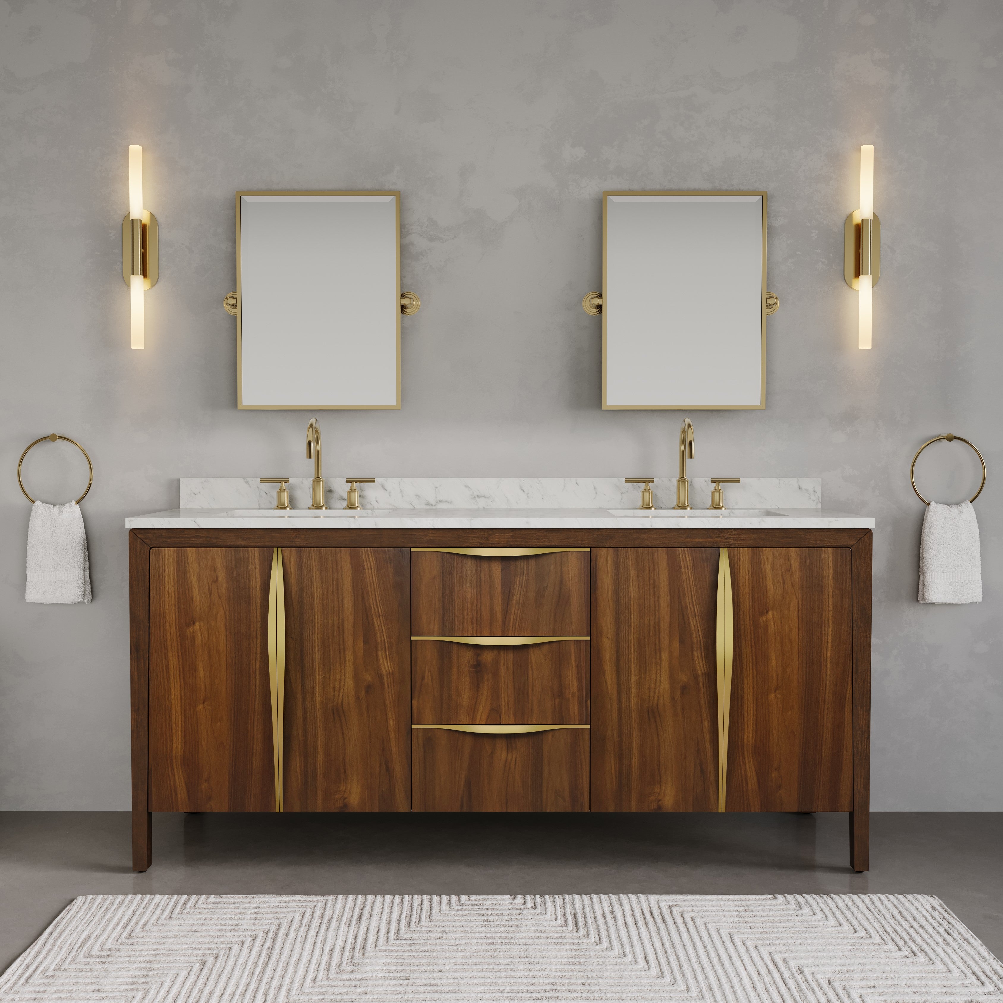 Palace 72 In. Double Sink Pre-Assembled Contemporary Style Bathroom Vanity With 1-9/16" Carrara White Quartz Top And Satin Gold Hardware