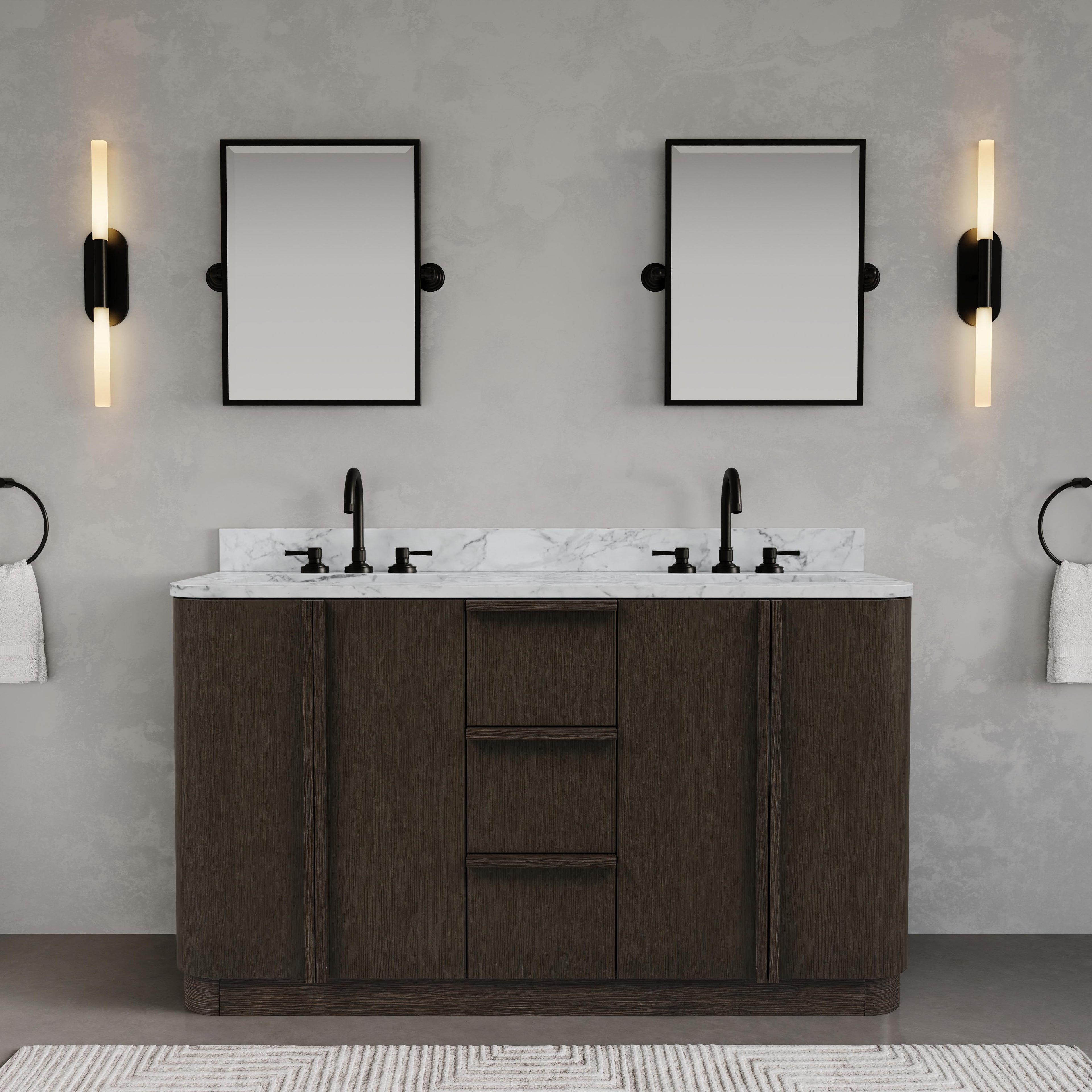 Chestnut 60 In. Double Sink Pre-Assembled Mid-Century Style Bathroom Vanity With 1" Carrara White Marble Top
